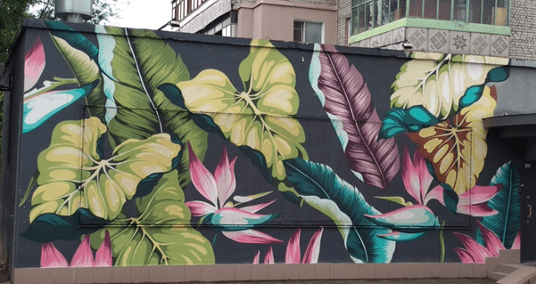 Цветет стенопись на медицинском учреждении и на Парамонова, 8. Если же дома не хватает для “лука” комнатных растений, визуально дополнить кадр сможет нарисованная монстера с другими тропическими цветами. Эффект погружения в магическую атмосферу – гарантирован!