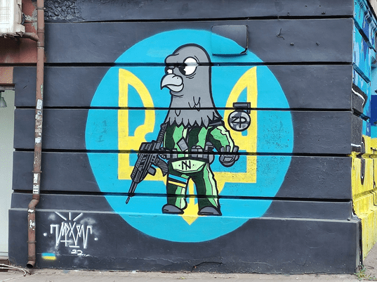 «Україна назавжди» привітає Вас на проспекті Соборному крокуючи до площі Фестивальної. Войовничий голуб, як жартівливий символ біологічної зброї кожного українця розташований далі по проспекту на будинку 172. Завершує серію Ліптон, аж у Дніпровському районі на кільці Каховської. З права від нього на паркані базується промовисте гасло «Запоріжжя – це Україна». Таке нагадування міцності духу та незламності, не тільки підтримує, але і є однією з улюблених інста-локацій запоріжців.